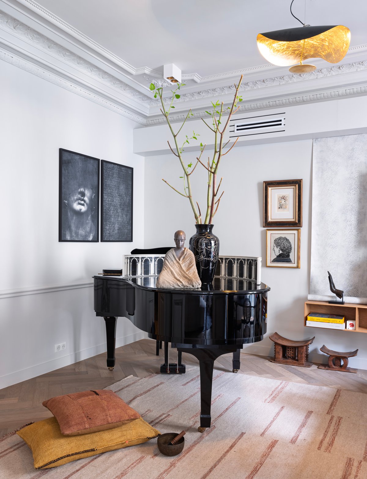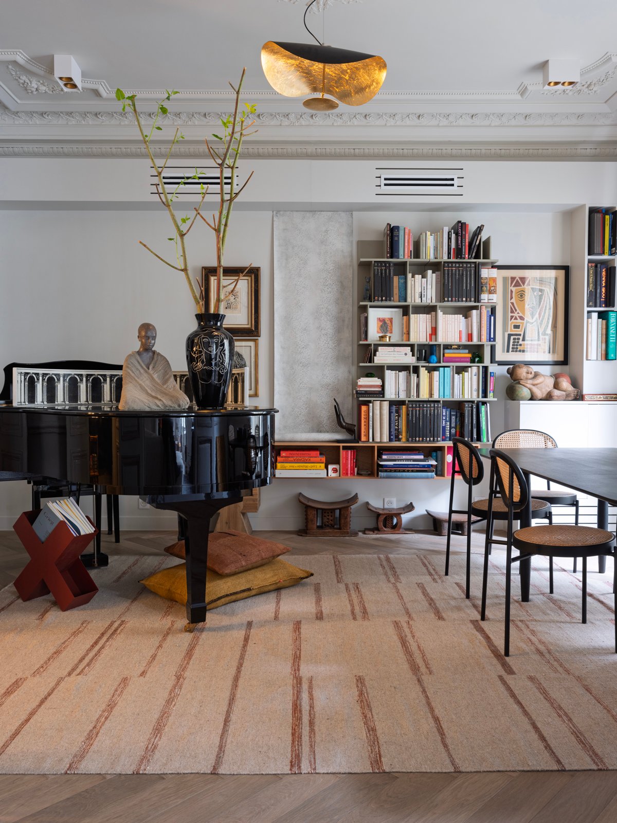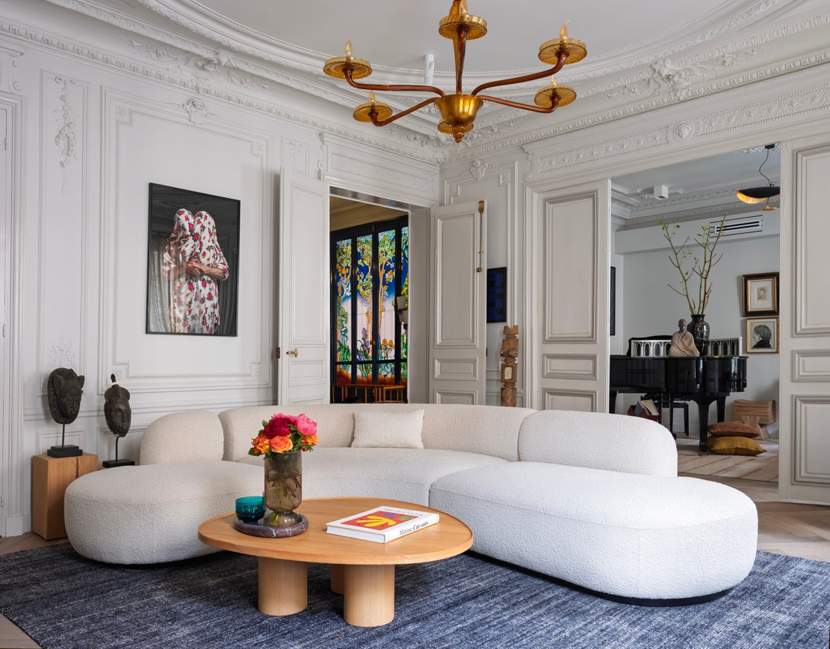 In this Haussmannian apartment (named for the grand 19th-century renovations led by Baron Georges- Eugène Haussmann), that sense of creative liberation pulses through every room. It’s a space that honors its architectural bones while embracing a bold, modern spirit. The result is as if old-world elegance met a fearless curator with an eye for soul—and they fell madly in love.
