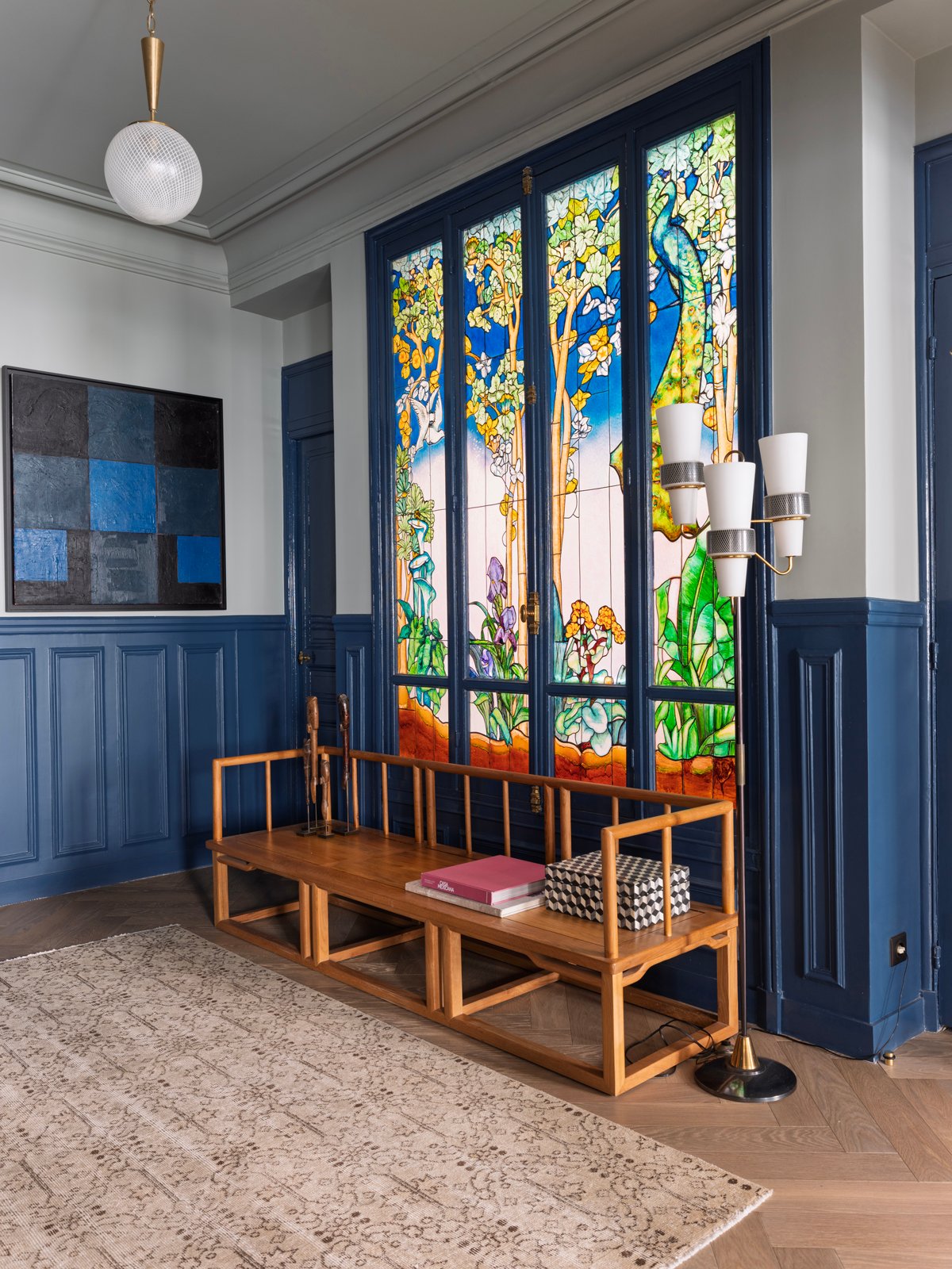 The adjacent foyer continues the artful storytelling. A stained glass window depicting trees and florals, installed by the previous owner, filters soft light into the hallway. Though not initially Savitt’s style, instead of replacing it, the designer embraced it, pulling rich cobalt blue from the glass to paint the trim, doors, and lower walls. It’s an unexpected gesture that both grounds and elevates the space. Overhead, a 1930s Carlo Scarpa for Venini fixture crafted using the reticello technique radiates softly. A nearby floor lamp, an Italian vintage piece from the 1950s with three conical glass shades, adds warmth and whimsy.