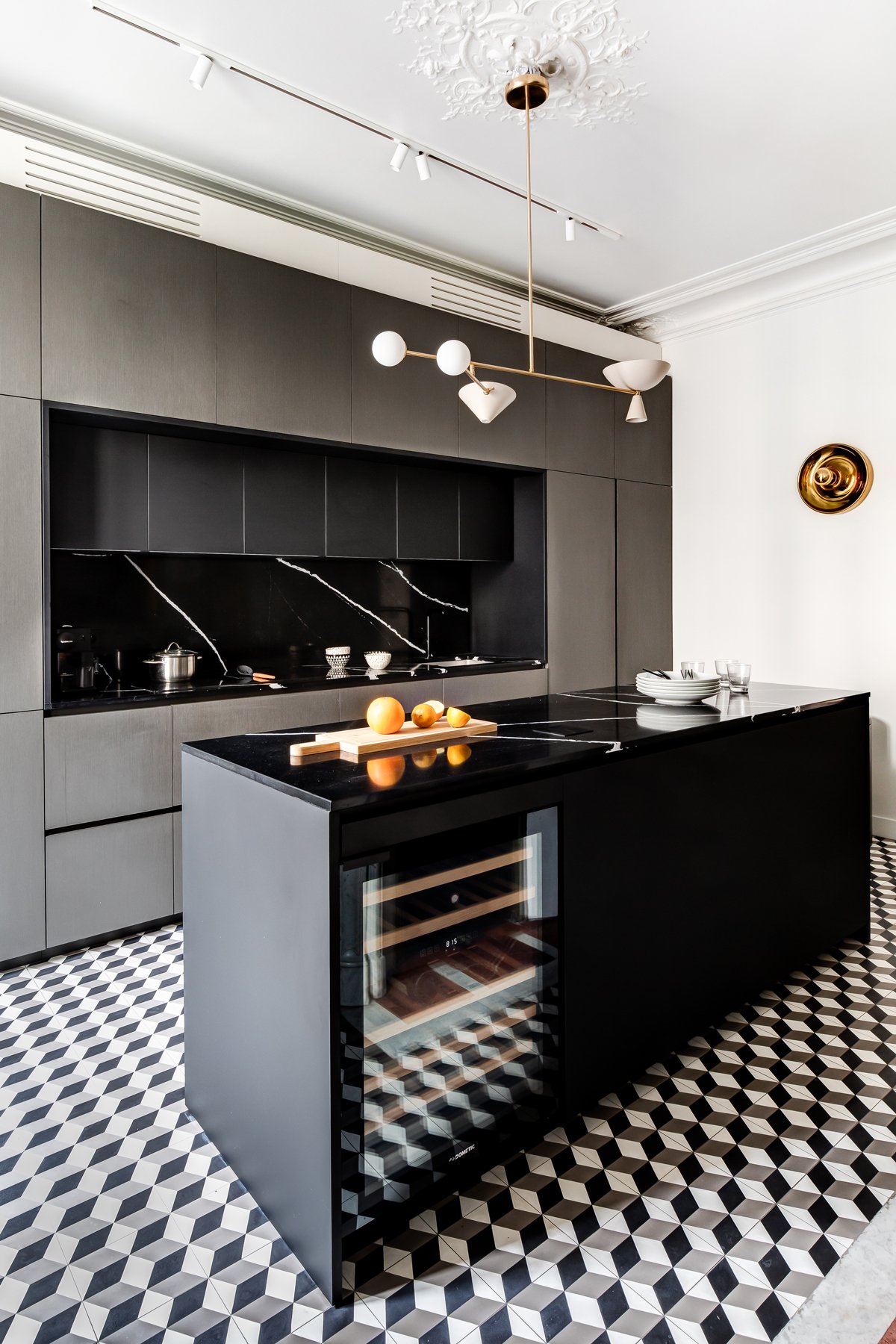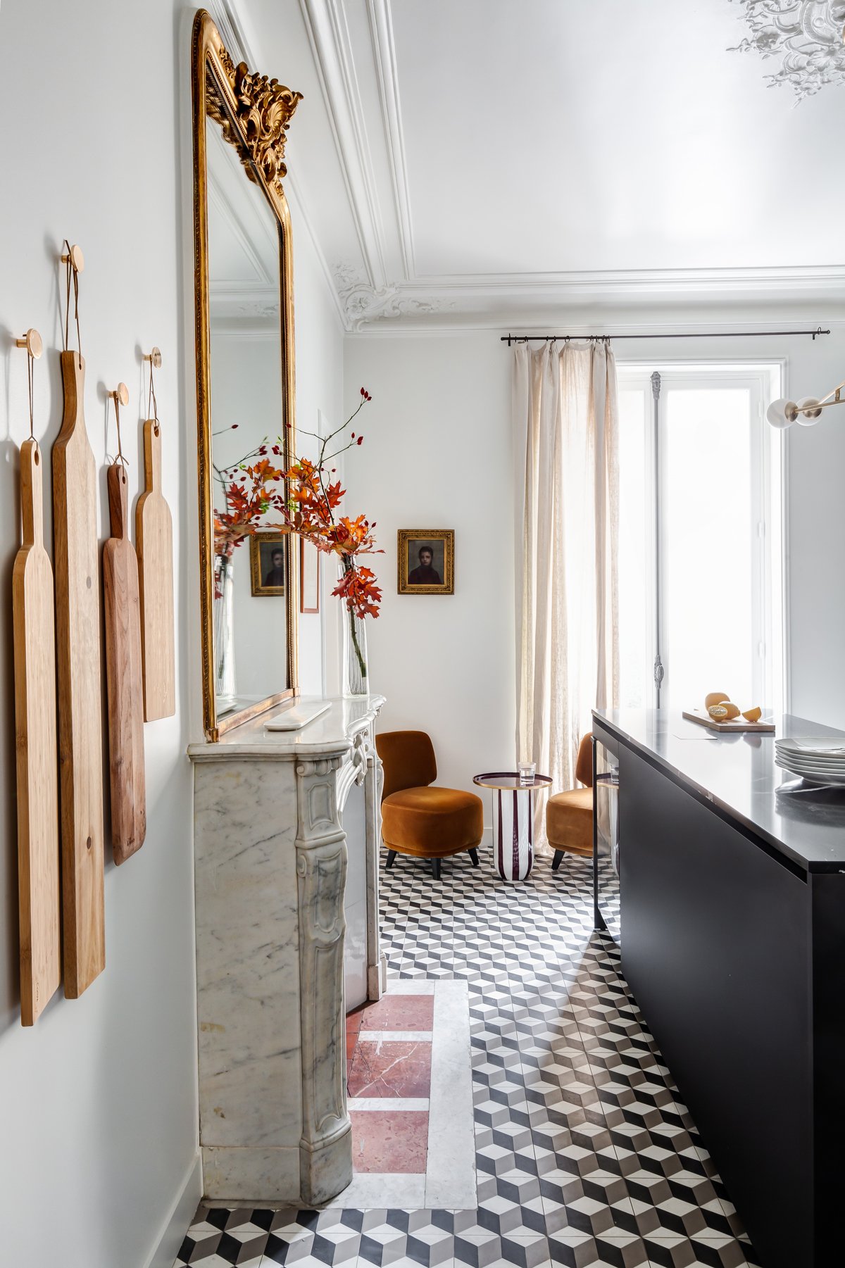 In contrast to the ornate heritage features elsewhere, the kitchen is unapologetically modern. Sleek Italian cabinetry in a matte anthracite grey finish and a geometric tiled floor set a contemporary tone, while vintage lighting including a brass sconce and sculptural chandelier, adds warmth. An original marble fireplace remains intact, proving that elegance and efficiency aren’t mutually exclusive. Along the wall, a collection of cutting boards dangle from leather straps—functional, beautiful, and unmistakably personal. The central island becomes a convivial gathering spot, where friends linger over conversation or an aperitif.