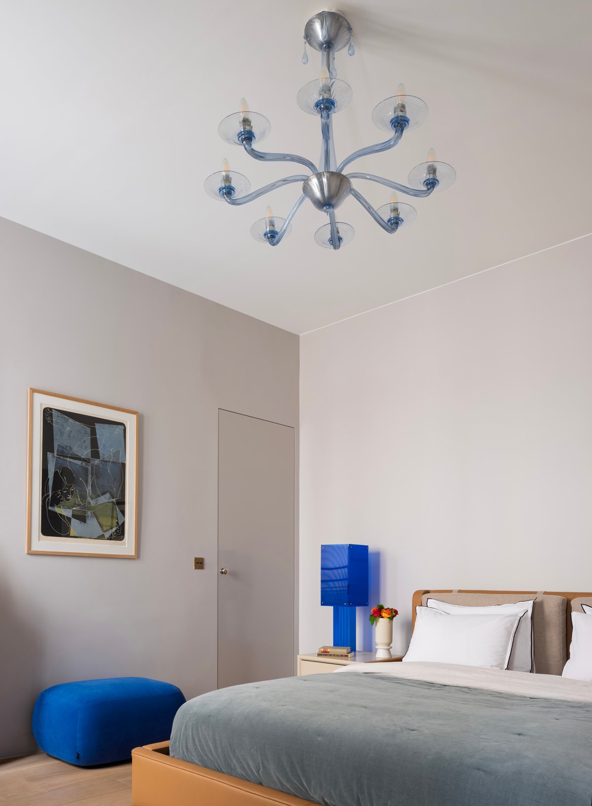 The primary bedroom is a study in serenity—with surprises. Pops of cobalt blue appear in a Murano chandelier, a lucite bedside lamp, and the ottoman, offering bursts of energy within a muted palette. The primary bathroom perhaps best captures the apartment’s ethos. Richly appointed, it features rare Gris de Sainte Anne marble from Belgium on the vanity and tub surround. Italian porcelain tiles climb the walls. Milk glass fixtures and polished chrome hardware add a touch of vintage hotel glamour.