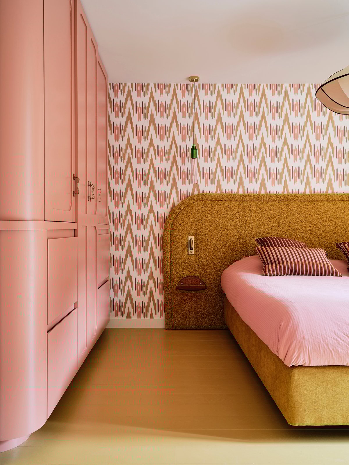 “When designing a home, the rooms need to speak with each other. If you have several bold colors in one room, take one of those colors and carry it into the next, creating a sense of overall cohesion,” explains Dohmen. The ochre from the kitchen barstools are carried into the primary bedroom, a jewel box of saturated hues and vibrant prints. Vivid wallpaper sets the stage for a custom headboard with built-in reading lights and small-scale night stands. The effect is immersive and dimensional. “You can create intrigue with different tones of the same color,” Nicole says. “You can do different shades of peach or purple, for example.” The curves of the built-in armoire further elevate the experience. This retreat is an energizing, intriguing cocoon for the senses.