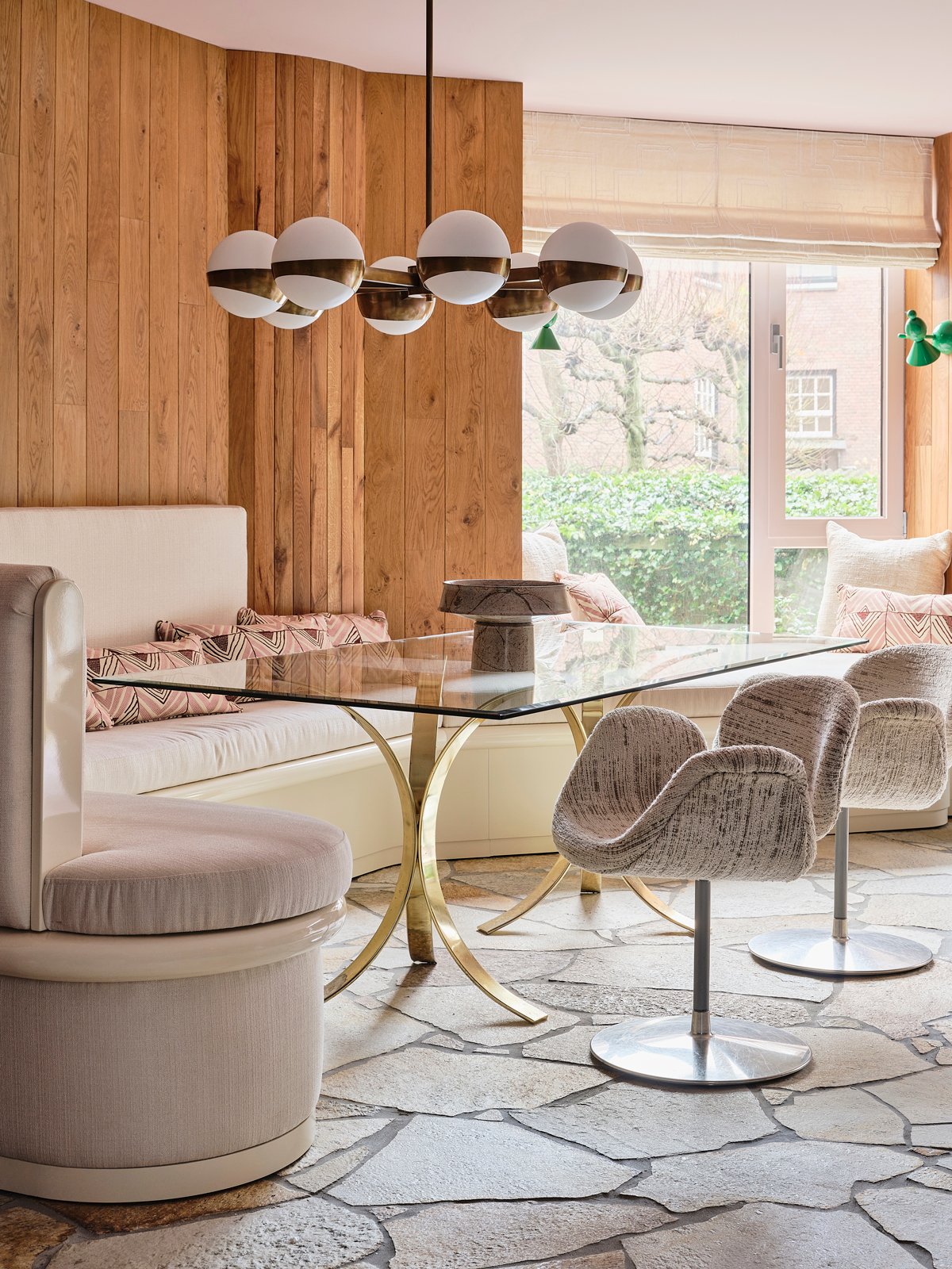 Originally built as a church, the condo retains echoes of its past: stone flooring, pillars, and lovely natural light. But it needed a fresh perspective to truly sing as a residence. The main living area, an open-concept space combining kitchen, dining, and sitting zones, offered both opportunity and challenge. Dohmen embraced the existing architectural elements and layered on her own touch: rich wood paneling that nods to mid-century style, and a materials mix that balances tension and harmony. The palette—aubergine, ochre, rose, and petrol (a deep teal)— delivers an immediate jolt. “Color is very powerful,” she says. “It’s not a trend—it’s a tool.” The result is otherworldly, evoking a space that feels unbound by time. It’s intriguing, invigorating, and unlike anywhere else.