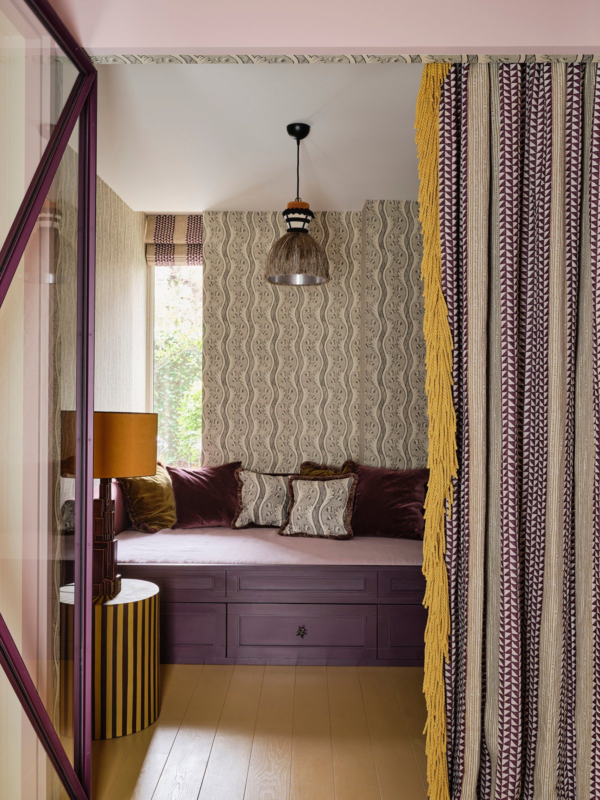 In the petite guest room, space is expertly utilized, with the custom built-in bed doubling as a sitting area when not in use. The graphic print draperies with dramatic fringe can be pulled for privacy, or left open, allowing natural light to stream through the glass doors. The pattern on the wallpaper is brought into the pillows, and the striped side table adds one more large-scale pattern.