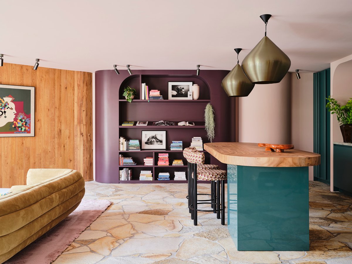 In the kitchen area, the island conjures the elegance of an atelier rather than a utilitarian prep space. “We designed this piece so that it’s more like a centerpiece, seamlessly merging the two zones,” explains Dohmen. The matte aubergine bookshelf beyond enhances the sculptural effect with it’s curved edges and angled reading shelf. On the other side of the room, a built-in banquette offers a plush, practical, and stylish dining solution. A vintage Fritz Hansen wire accent chair in a vibrant green and a Baxter Tactile sofa in a muted mossy hue rest atop a soft pink shag rug.