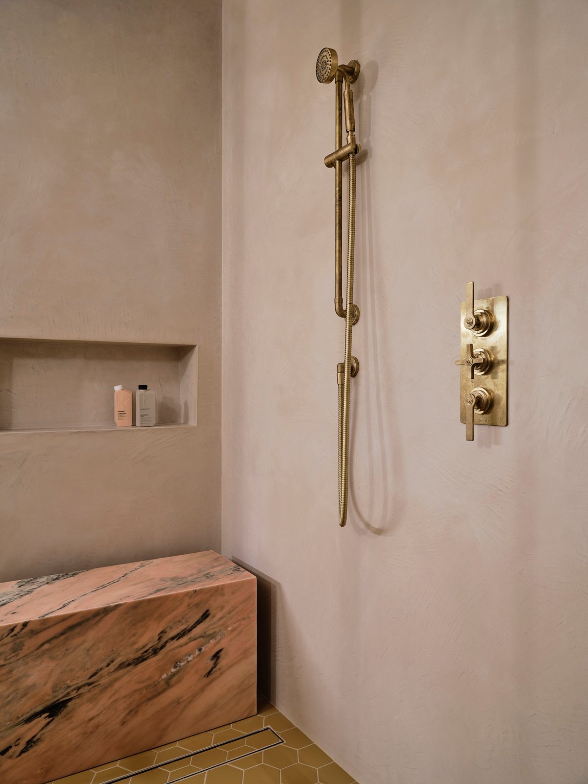 The bathroom continues the story, with a stunning bench in pink marble, neutral textured walls, and a deep oxblood color on the metalwork. The unlacquered brass of the showerhead and hardware will beautifully patina over time.