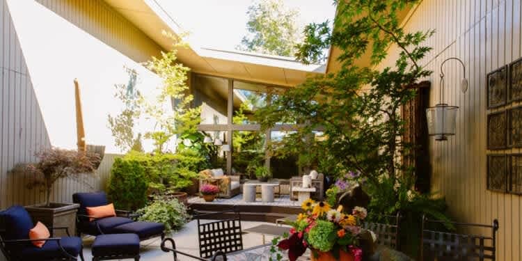 When Rich Schell and Greg Wragge first stepped into their 1969 home, cited as “international modern” on the original blueprints, the outdoor spaces and courtyard immediately sealed the deal for them. The home, built by well-known architect Robert Seavers, is a U shape, with the courtyard positioned in the center of the design, visible as you enter from the front.